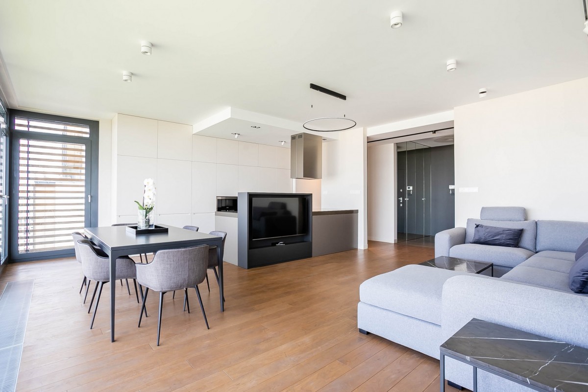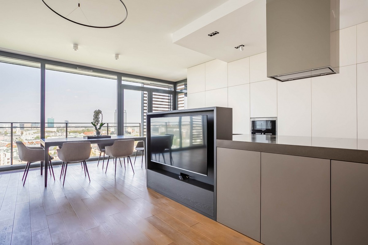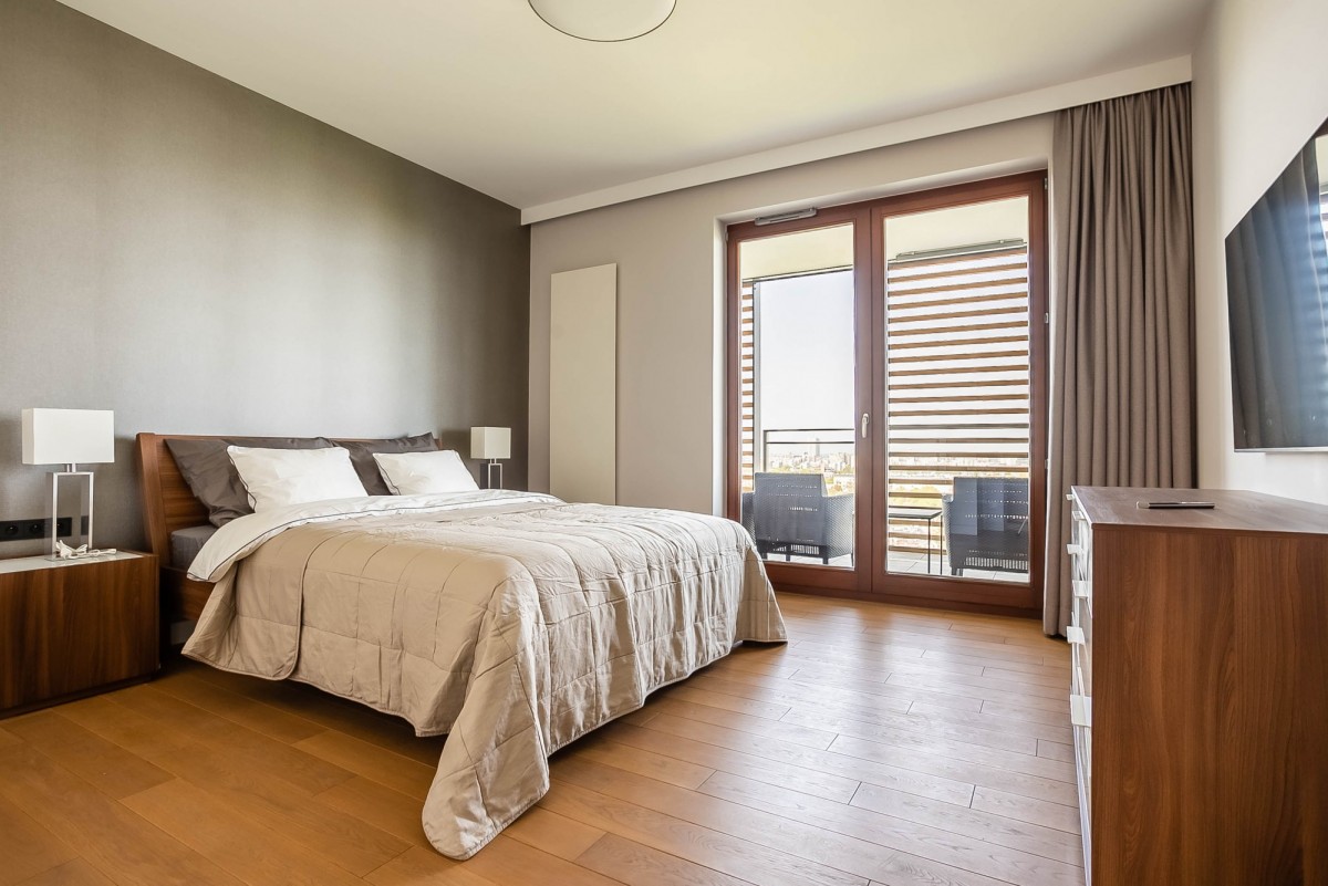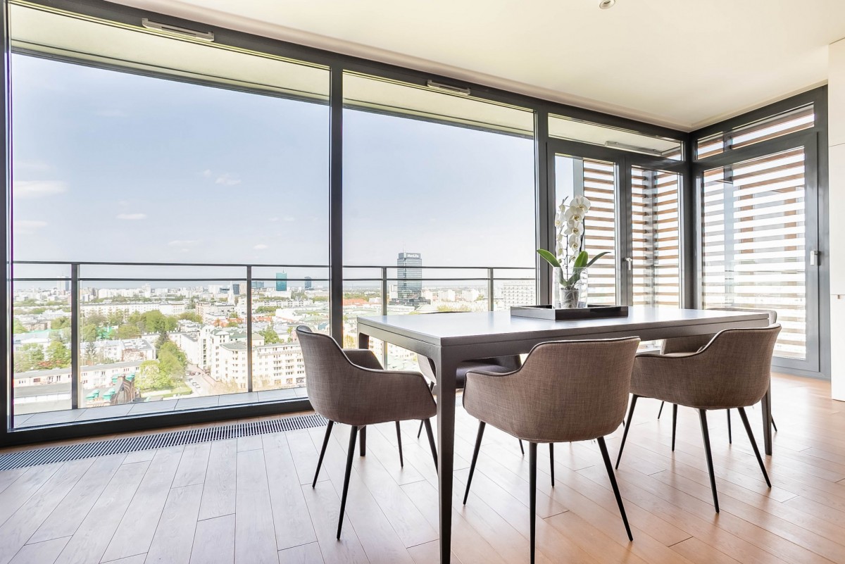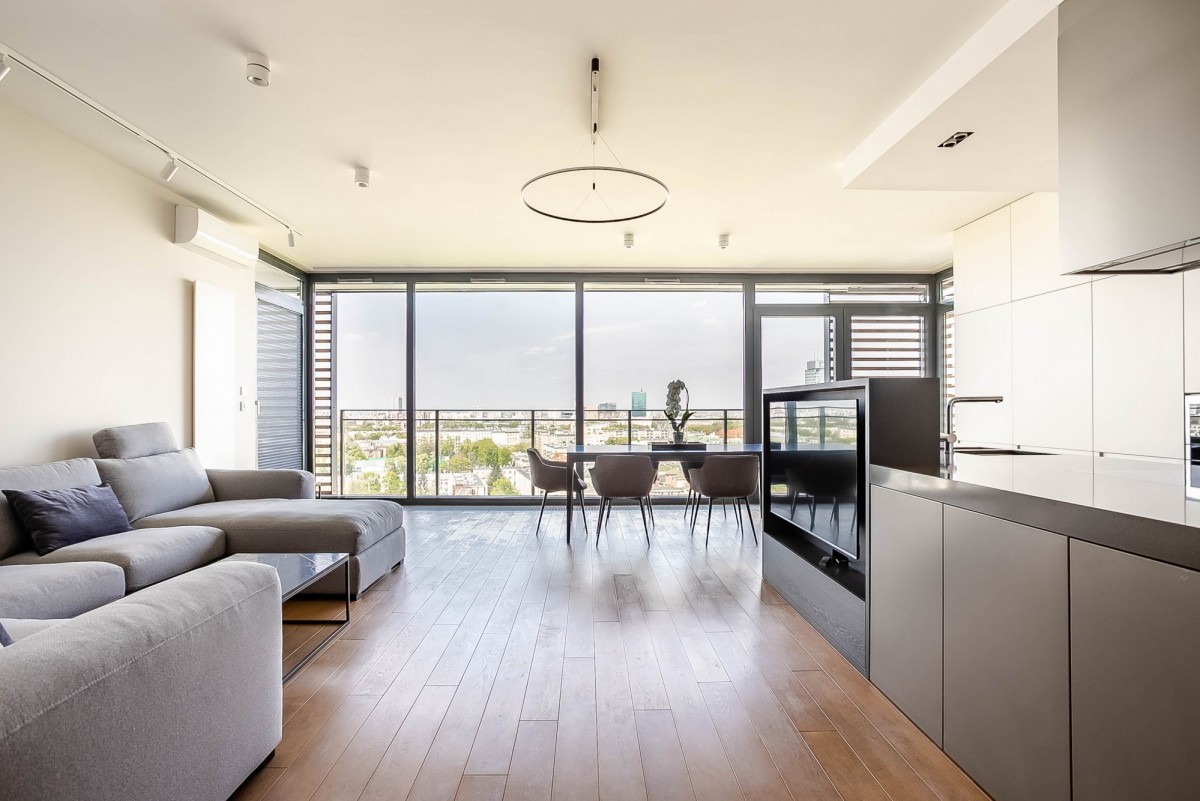 Prezentowany apartament o powierzchni 125 m2, położony na XIV piętrze w apartamentowcu. Mieszkanie wykończone jest w bardzo wysokim standardzie, przy użyciu wysokiej jakości materiałów i sprzętów.