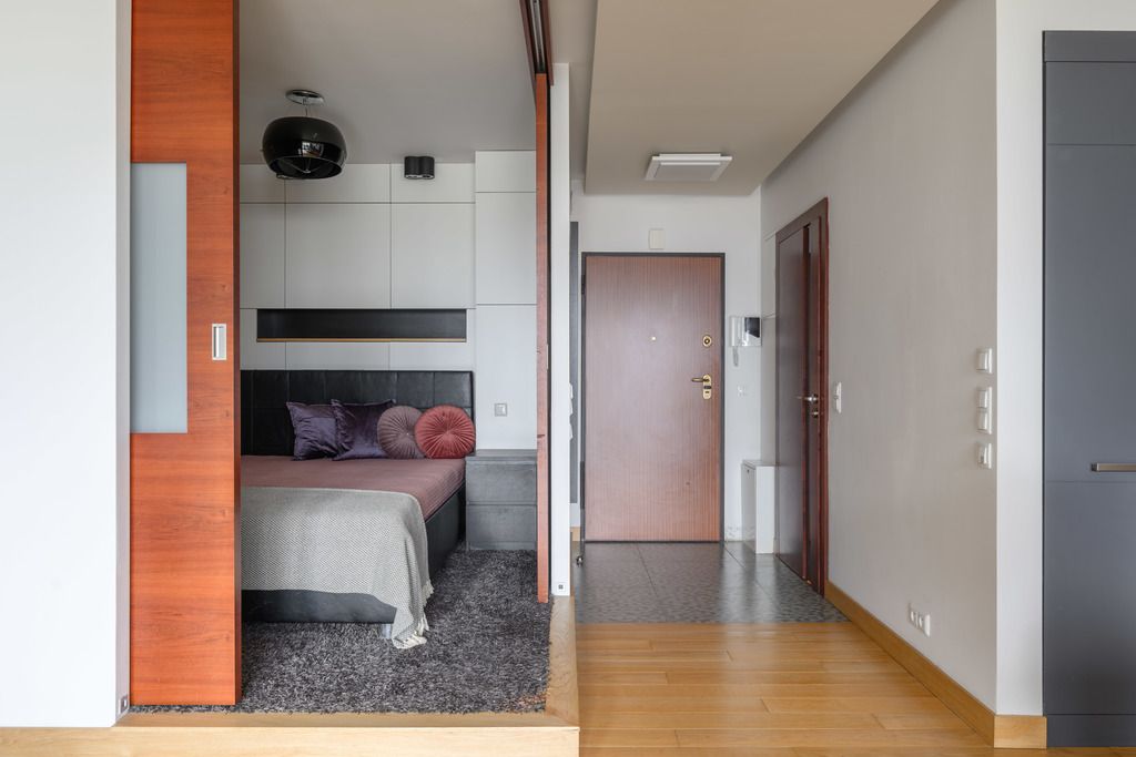Apartament o powierzchni 48m2 znajduje się na 9 piętrze. Składa się z przedpokoju, salonu z aneksem kuchennym, wydzieloną częścią sypialnianą, łazienki oraz balkonu.