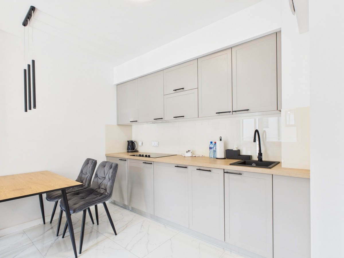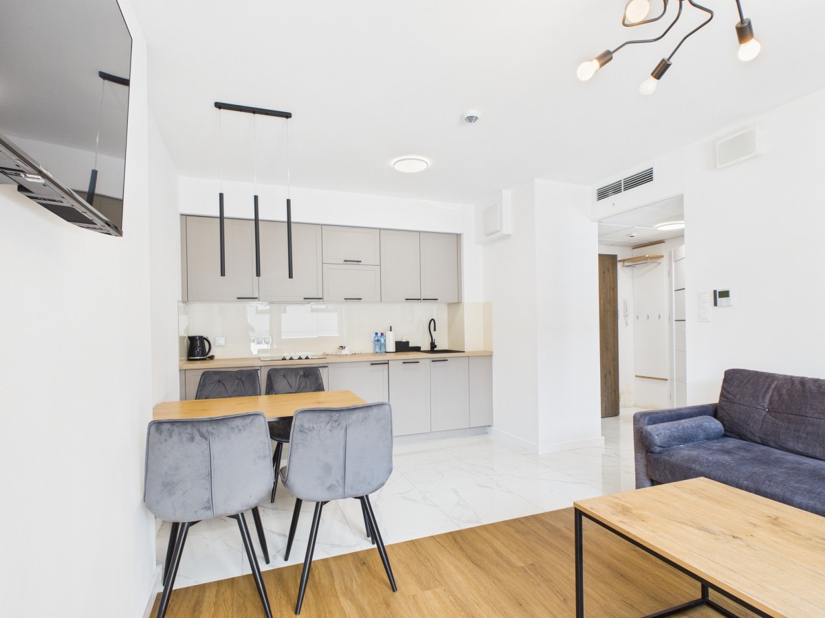 • przestronny salon z aneksem kuchennym, w pełni wyposażonym w sprzęt AGD i podstawowe akcesoria,