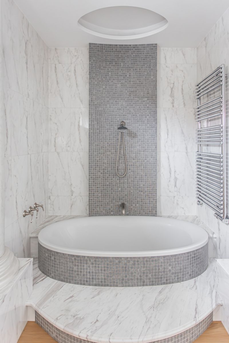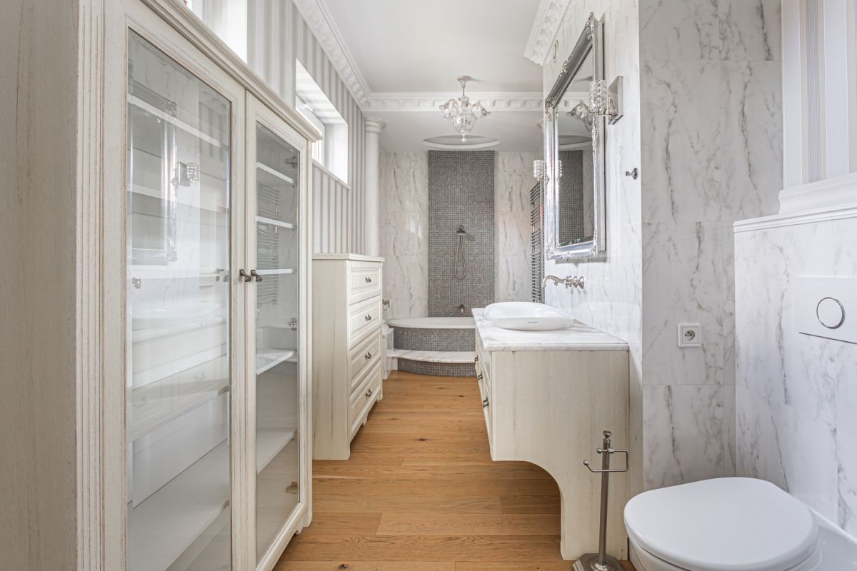 * duży pokój kąpielowy z wanną, ogrzewaniem podłogowym i wejściem z obydwu sypialni (14,28 m²),