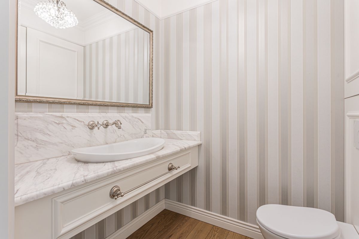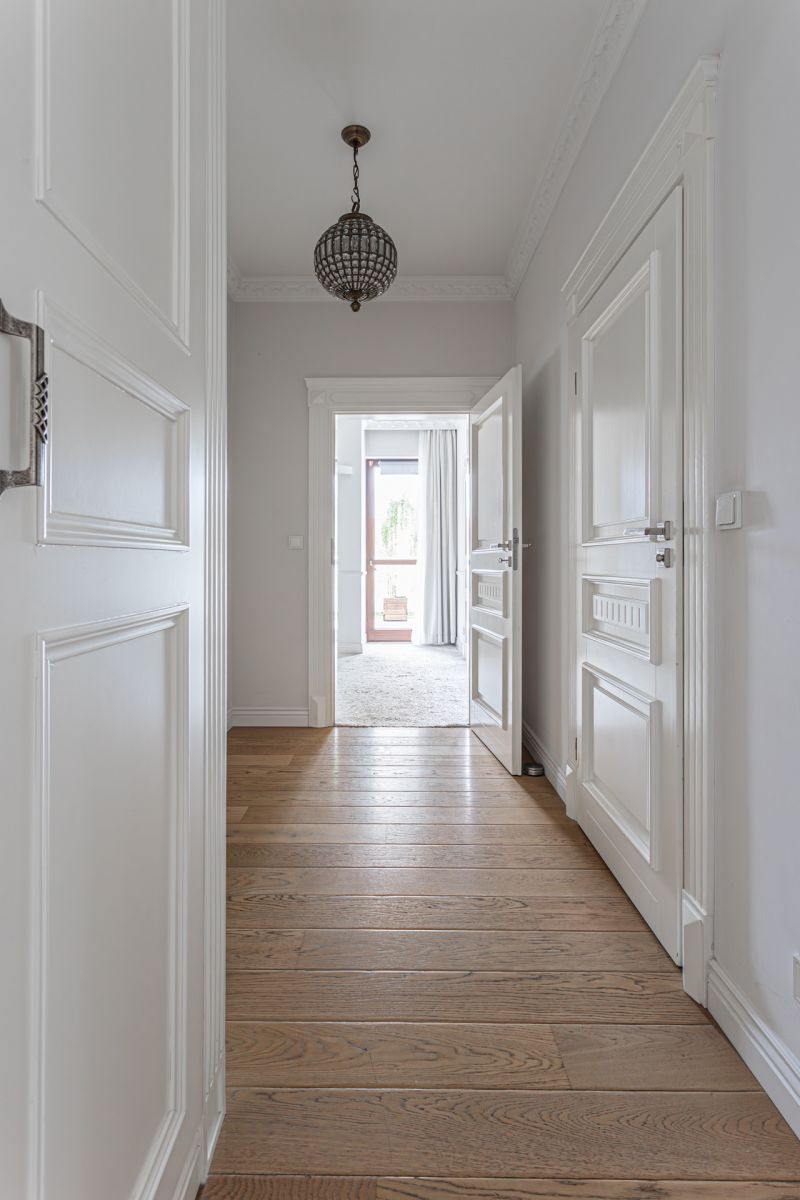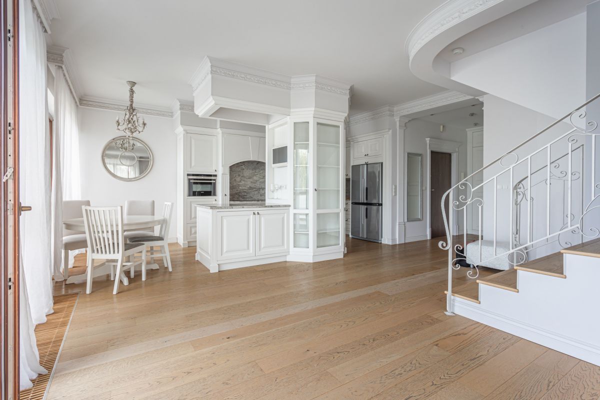 Apartament jest dwupoziomowy i wykończony w wysokim standardzie. Na podłodze położona jest szlachetna deska drewniana, a w holu znajdują się szafy w zabudowie.