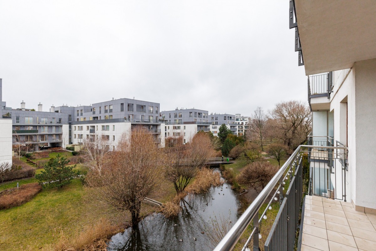 Dwustronna ekspozycja oraz południowo-zachodnia orientacja sprawiają, że mieszkanie jest jasne przez cały dzień, a jego usytuowanie zapewnia ponadprzeciętną prywatność, dzięki odsunięciu od sąsiednich budynków i widokowi na zieleń, w tym na oczko wodne, co dodatkowo podkreśla kameralny i spokojny charakter tej lokalizacji.