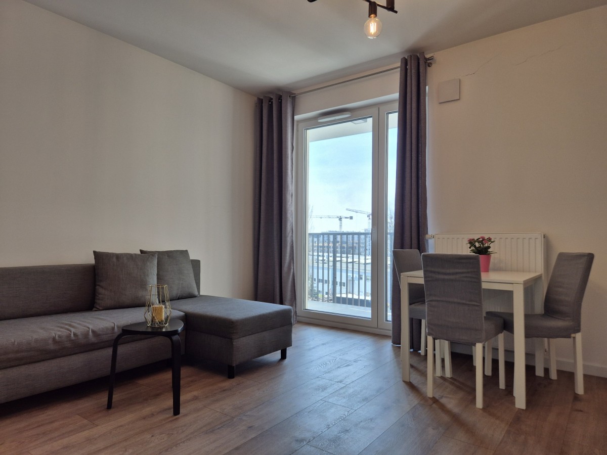 W części dziennej znajduje się wyjście na balkon z ekspozycją zachodnią, co zapewnia dobre doświetlenie mieszkania w godzinach popołudniowych. Pokój wyposażony jest w kanapę, stół z krzesłami oraz komodę.