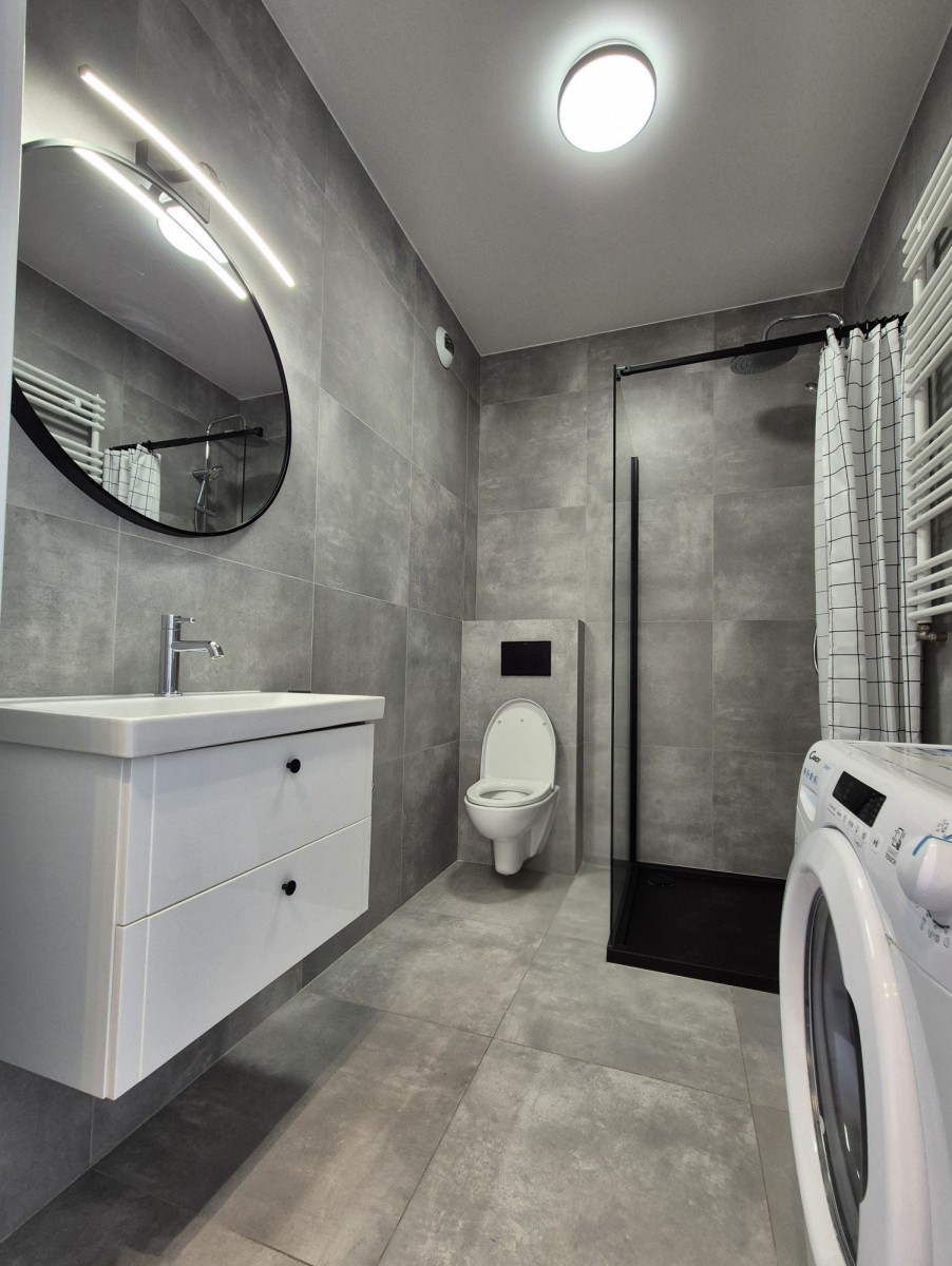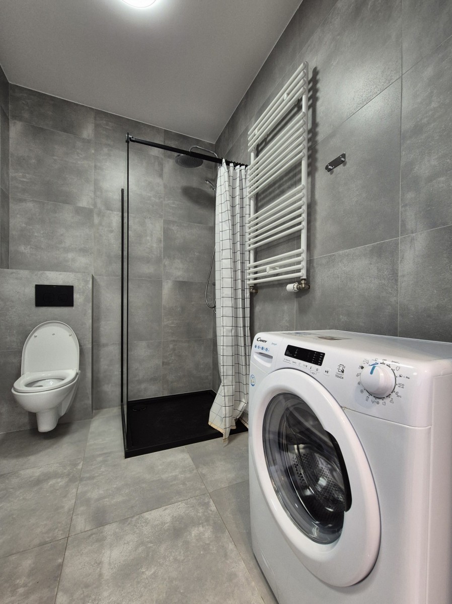 Łazienka wyposażona jest w kabinę prysznicową oraz pralkę.