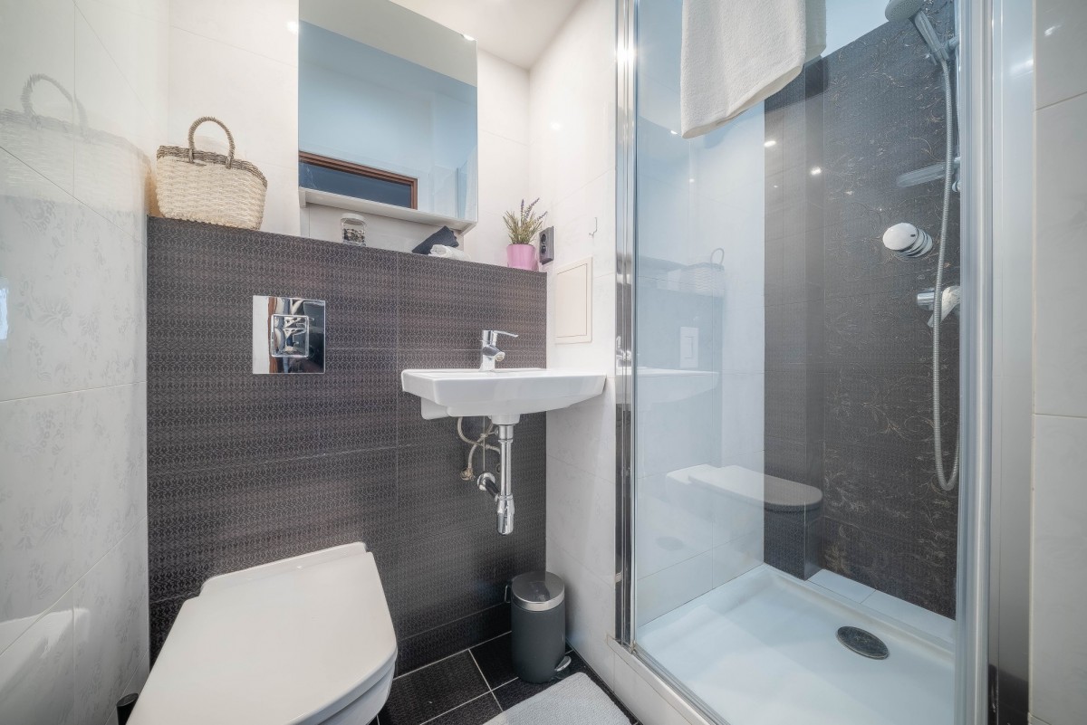 Łazienka: Nowoczesna, z kabiną prysznicową.