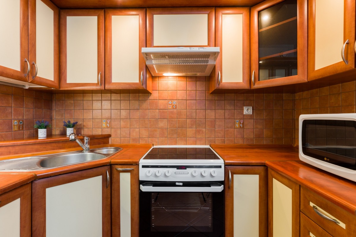* kuchnia stanowi osobne pomieszczenie i jest w pełni wyposażona w niezbędny sprzęt AGD, w tym lodówkę z zamrażarką, piekarnik, płytę grzewczą oraz zmywarkę,