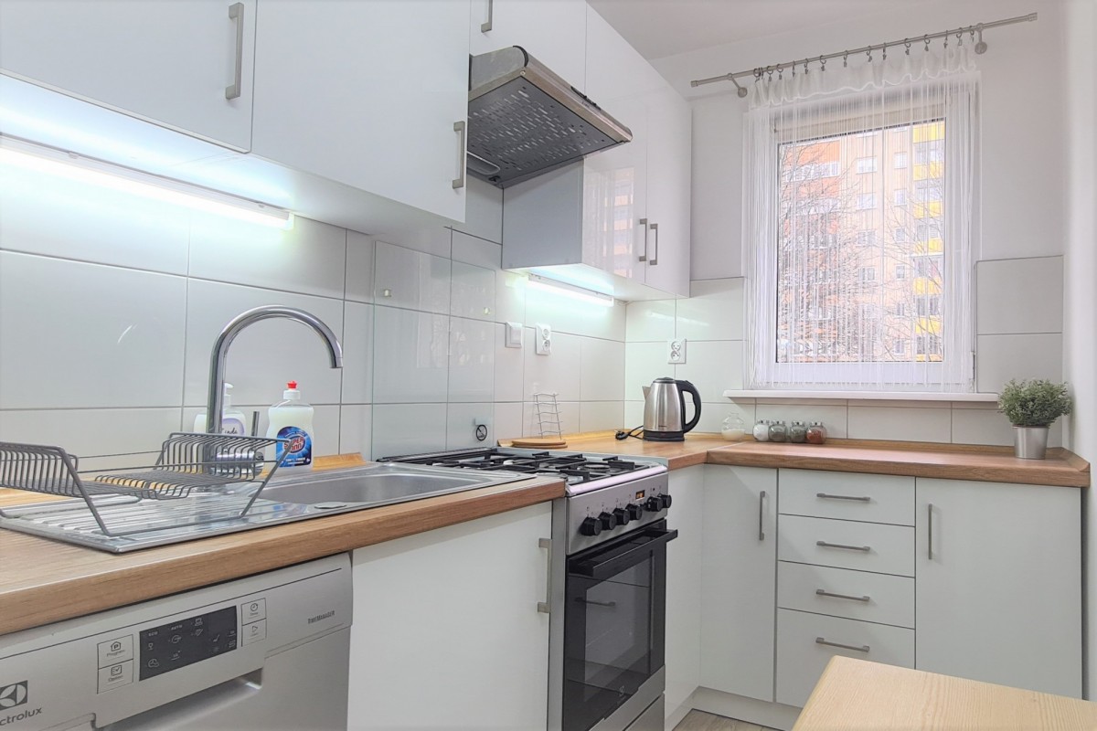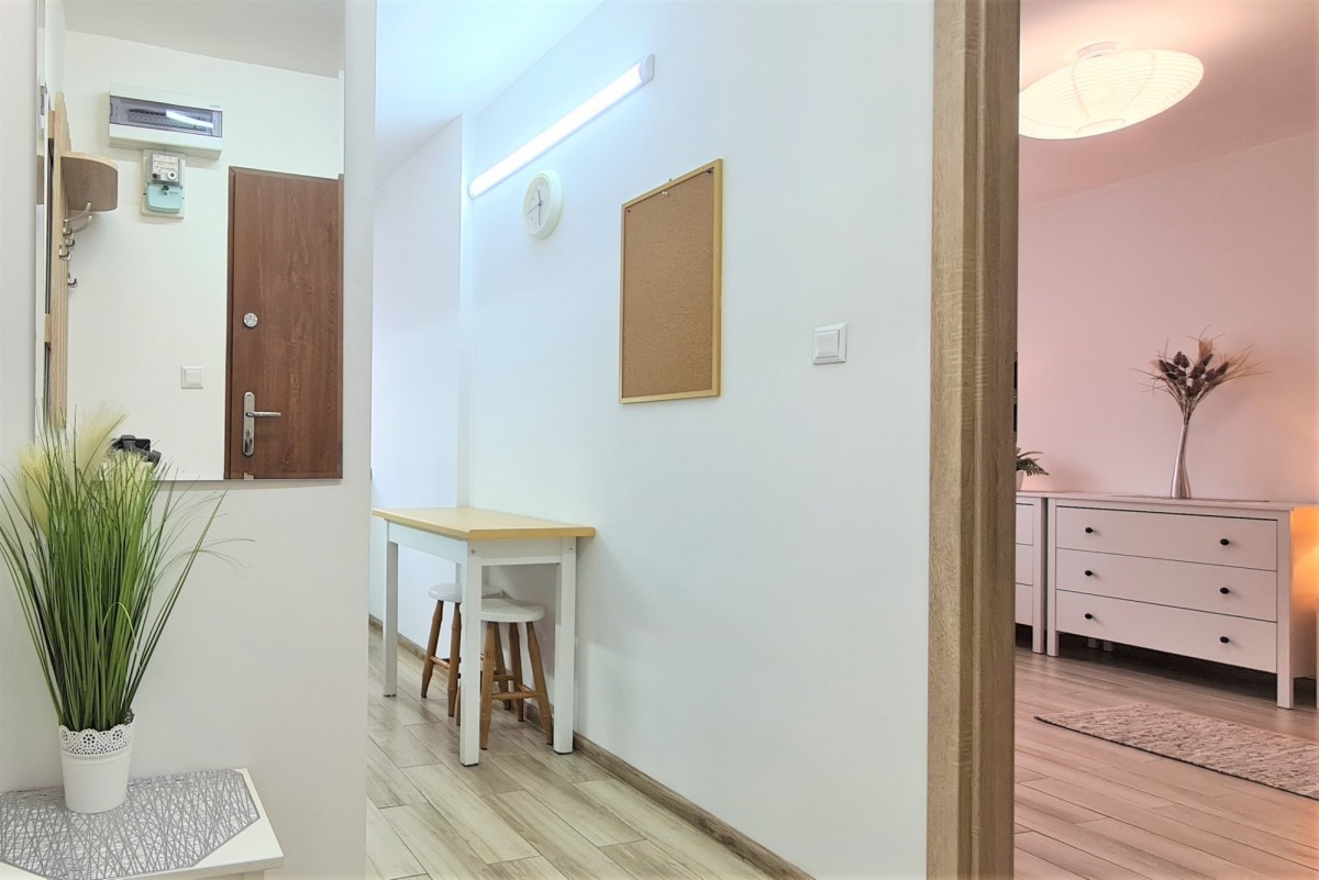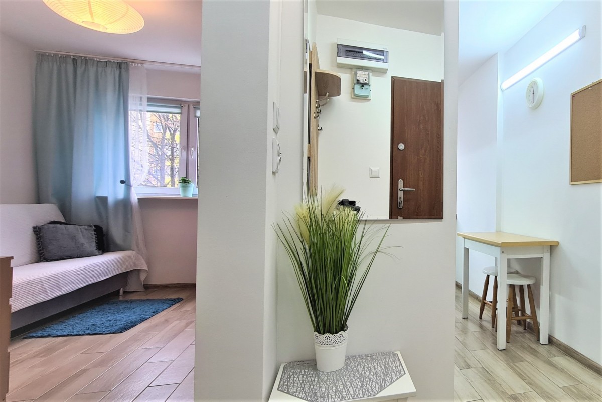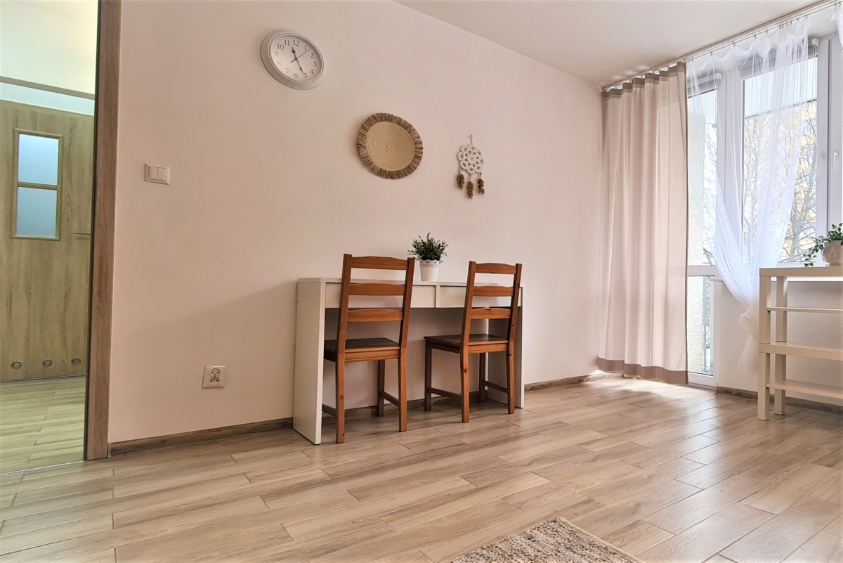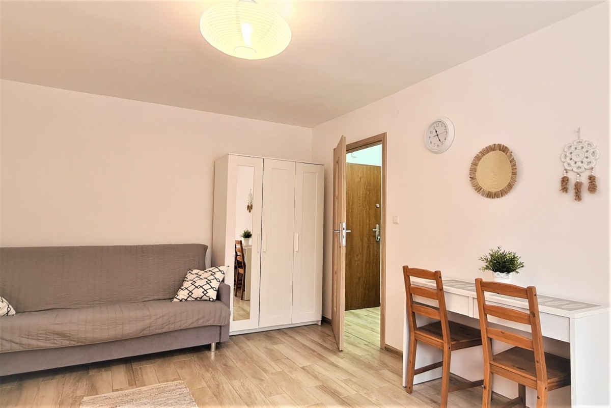 Mieszkanie składa się z jasnego salonu z wyjściem na balkon, oddzielnej sypialni, otwartej kuchni z oknem oraz łazienki z prysznicem. Przemyślany układ pomieszczeń sprawia, że przestrzeń jest wygodna zarówno dla jednej osoby, jak i dla pary.