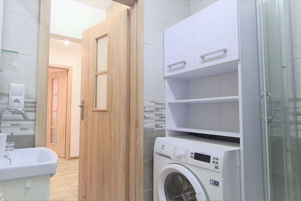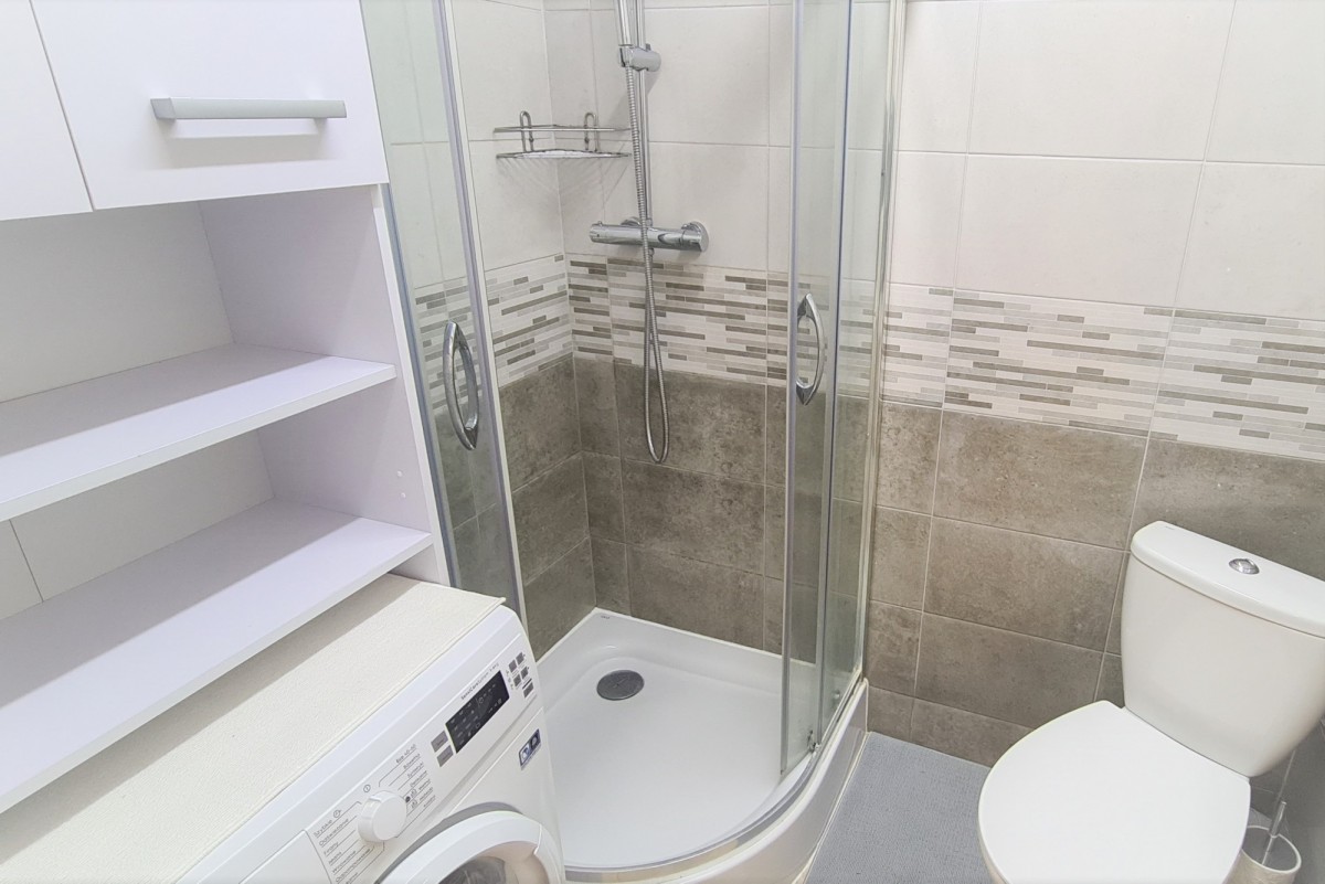 W łazience znajduje się prysznic, umywalka, WC oraz pralka.