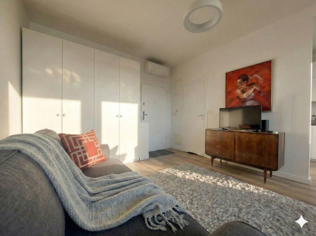 - pokój główny - przestronny i jasny. Znajduje się tu rozkładana, wygodna kanapa, pojemna, trzydrzwiowa szafa, designerska komoda z szufladami z lat 70-ych oraz stół w tym samym stylu wraz z krzesłami mogący służyć zarówno za miejsce do pracy jak i spożywania posiłków. Ekspozycja okien w kierunku południowo-wschodnim zapewnia idealne doświetlenie wnętrza klimatycznym, rozproszonym światłem. W ciepłe dni z pomocą przyjdzie klimatyzacja. Z pokoju można wyjść na sporej wielkości, ustawny balkon z widokiem na Śródmieście. Pomimo faktu, że budynek znajduje się w centrum Warszawy, samo mieszkanie jest niezwykle ciche i nawet przy otwartych oknach do wnętrza nie dociera wielkomiejski hałas.