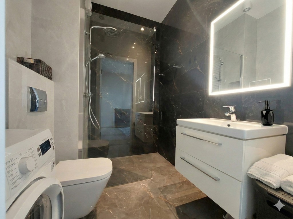 - łazienka - bardzo przestronna i elegancka, z prysznicem typu walk-in, umywalką, toaletą i pralką. Na uwagę zasługują dbałość o estetykę i duże, podświetlane lustro.