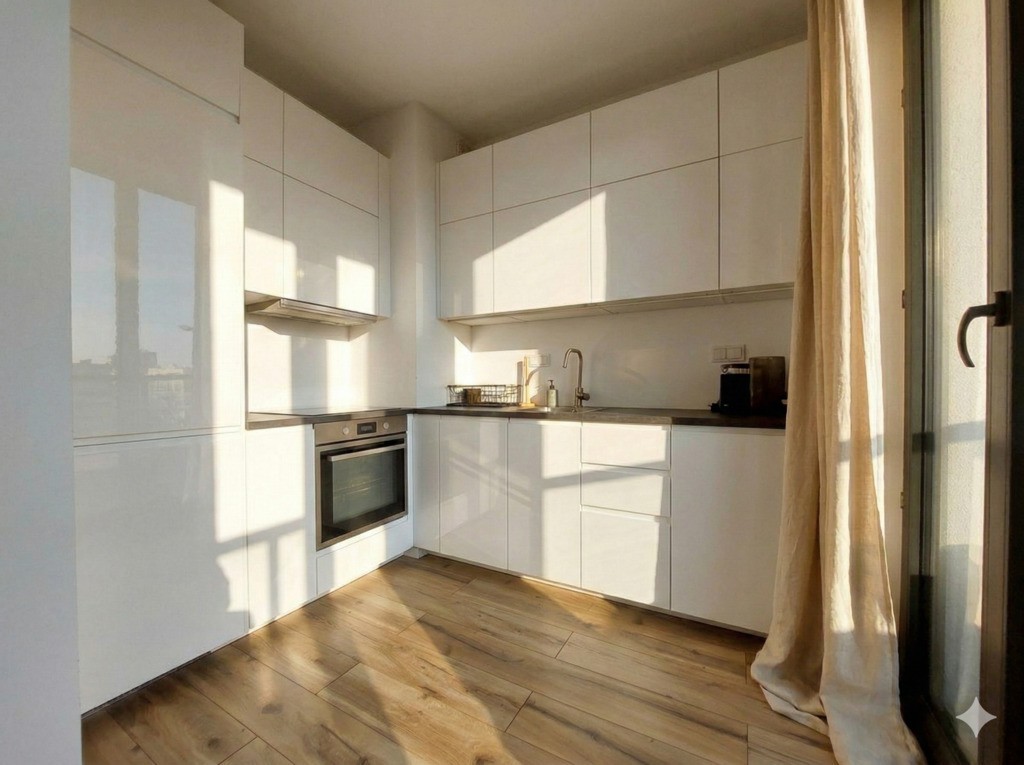 - kuchnia - oddzielna, funkcjonalnie zaaranżowana i starannie wykończona. Wyposażona dużą ilość szafek, lodówkę z zamrażalką, kuchenkę indukcyjną, piekarnik elektryczny, okap, zmywarkę i jednokomorowy zlew.