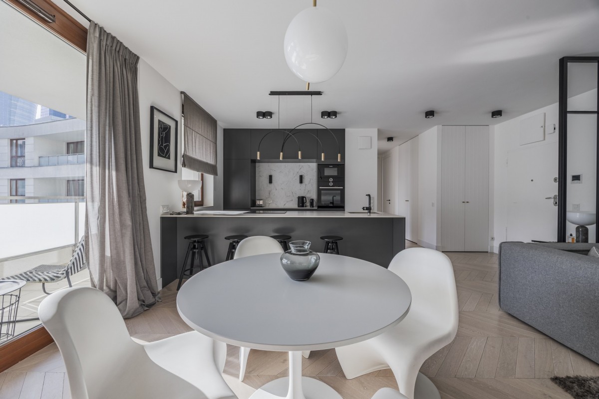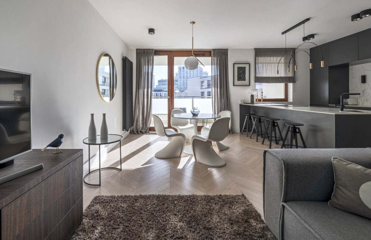 Ta okolica to nowe śródmieście Warszawy i centrum biznesowe miasta. Nieopodal tętnią życiem Browary Warszawskie i Fabryka Norblina, jednak ten apartament - dzięki położeniu przecznice dalej - zapewnia ciszę i azyl od zgiełku miasta.