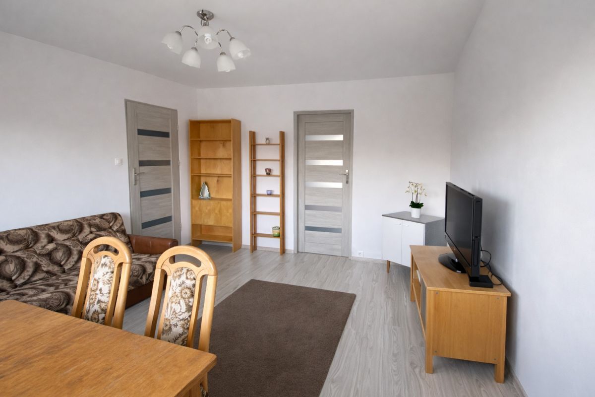 - przechodniego przestronnego salonu/pokoju z rozkładaną sofą, stołem oraz krzesłami,