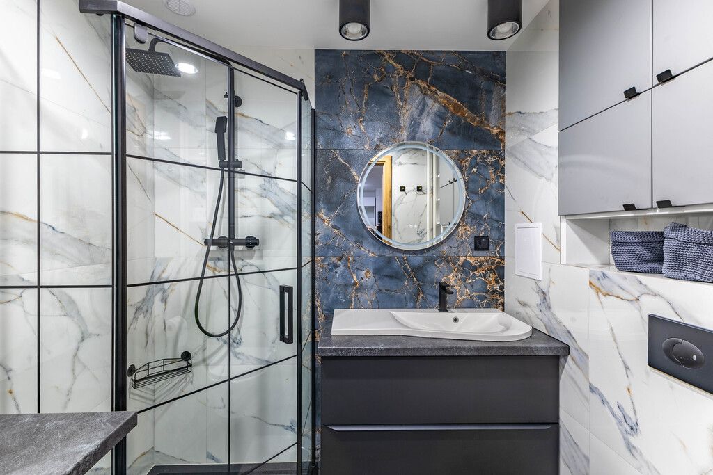 - Łazienka z dużą kabiną prysznicową i pralką – stylowa i funkcjonalna,