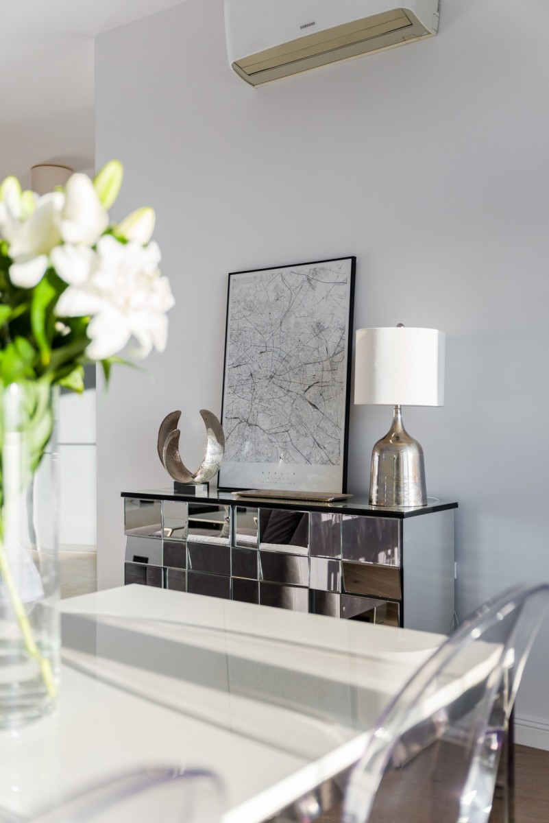 Apartament znajduje się na 7 piętrze, dzięki czemu oferuje spektakularne światło oraz otwartą perspektywę miasta. Zachodnia ekspozycja salonu pozwala cieszyć się popołudniowym słońcem, a wschodnia część mieszkania odsłania panoramę Warszawy widoczną z sypialni.