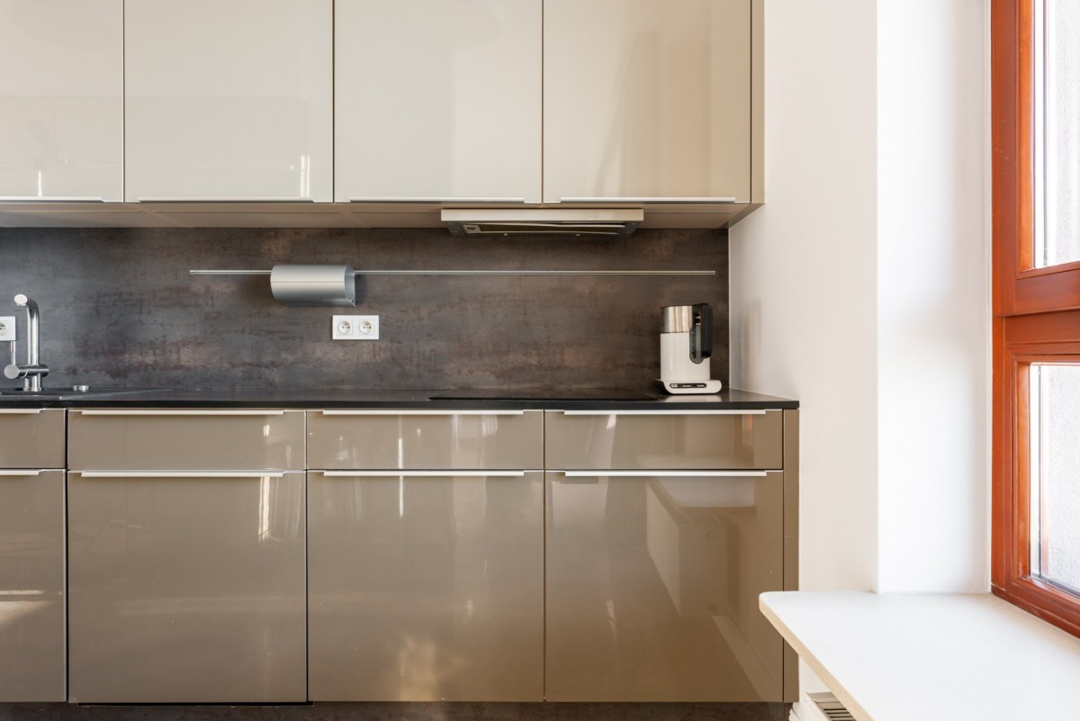 * otwartą kuchnię z oknem, wyposażoną w pełen zestaw sprzętów AGD: lodówkę z zamrażarką, zmywarkę, piekarnik oraz ekspres do kawy