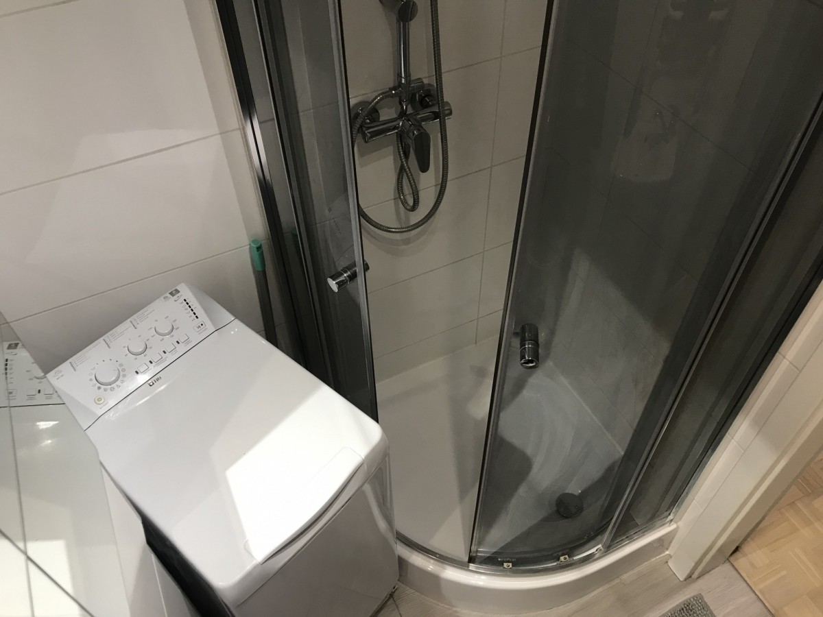 Łazienka z kabiną prysznicową i pralką.